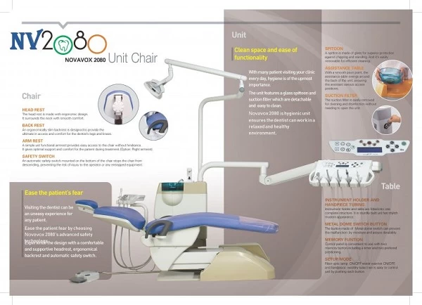 Bảo Minh Medical là đơn vị nhập khẩu và phân phối độc quyền thiết bị ghế nha khoa NV2080 của Hàn Quốc. Ghế nha khoa NV2080 của hãng Novavox sản xuất sẽ mang đến sự thoải mái và yên tâm cho bệnh nhân với công tắc an toàn tự động được gắn dưới ghế ngăn không cho ghế giảm dần, ngăn ngừa nguy cơ thương tích cho người điều khiển hoặc bất kỳ thiết bị nào bị vướng.